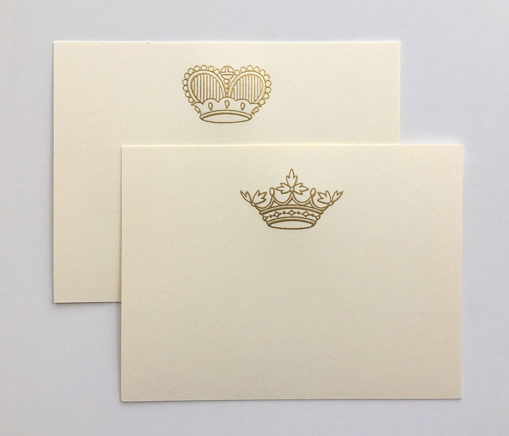 Two crown designs. Each card features exquisite gold engraved crowns, appealing to the royal in all of us. The perfect notecards to express your personal messages.
