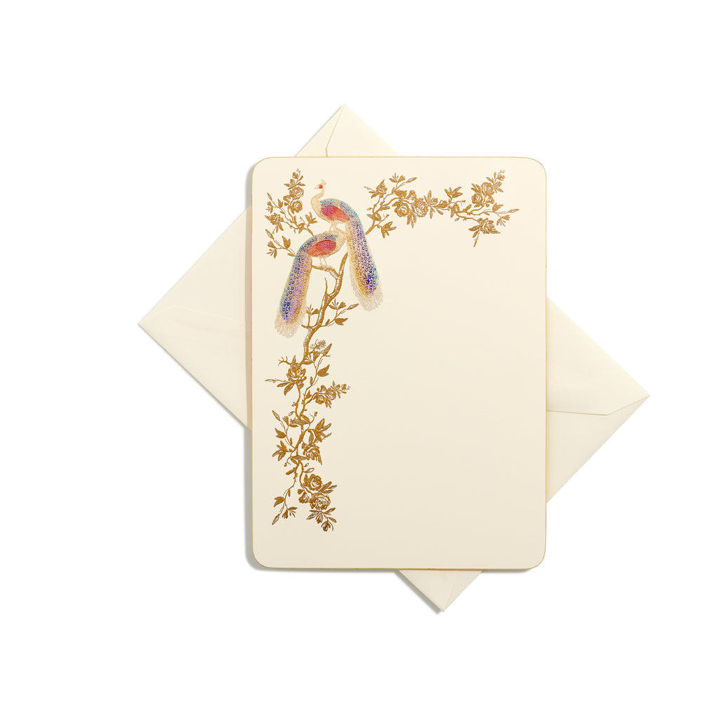 Two individually hand-painted peacocks are perfectly complimented by rich gold engraved foliage in this stunning Grand Statement Card. As in nature, no two cards are ever alike.The Bernard Maisner Grand Statement cards are unique in the world of fine stationery requiring multiple press runs and heavy thickness stock. Use it to send the ultimate thank you note, or perfect as gifts to the special people in your life.