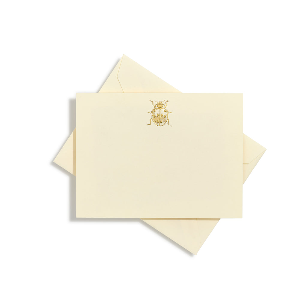 This lovely ladybug bring luck and abundance everywhere she goes. Exquisitely engraved in gold detail, this is the perfect notecard to send your messages of love and luck.