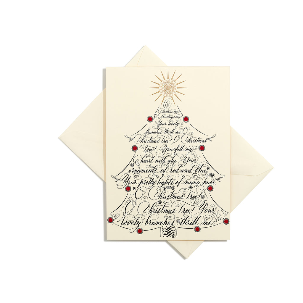 Send unrivaled holiday cheer with the classic O'Christmas Tree Carol Grand Statement Card. Engraved in gold, red, and black, this card perfectly captures the festive holiday season. The accompanying small sentiment card provides the perfect space for your thoughtful message. The Bernard Maisner Grand Statement cards are unique in the world of fine stationery requiring multiple press runs and heavy thickness stock. Perfect for the unique person in your life.
