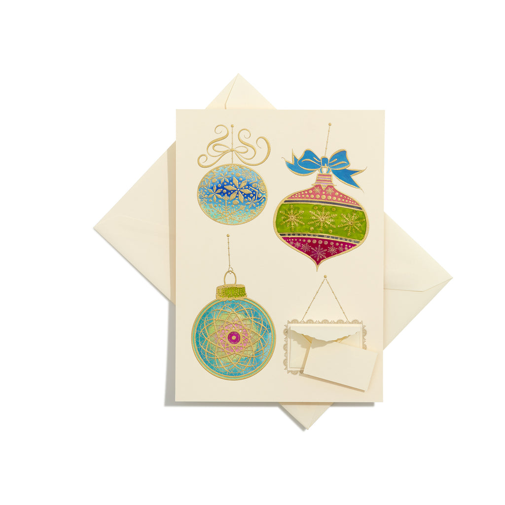 This colossal sized heavyweight note card is 10.5 x 7.5 inches. First engraved in deep gold, each of the 3 large holiday ornaments are individually hand painted. No two are ever alike. Opulent and beautiful in every way, it makes a stunning and festive impression. Comes with outer mailing envelope, 100% cotton cream papers. Your message goes on the little card that goes into the tiny envelope. The lucky recipient will treasure your message forever. One card with matching envelope.