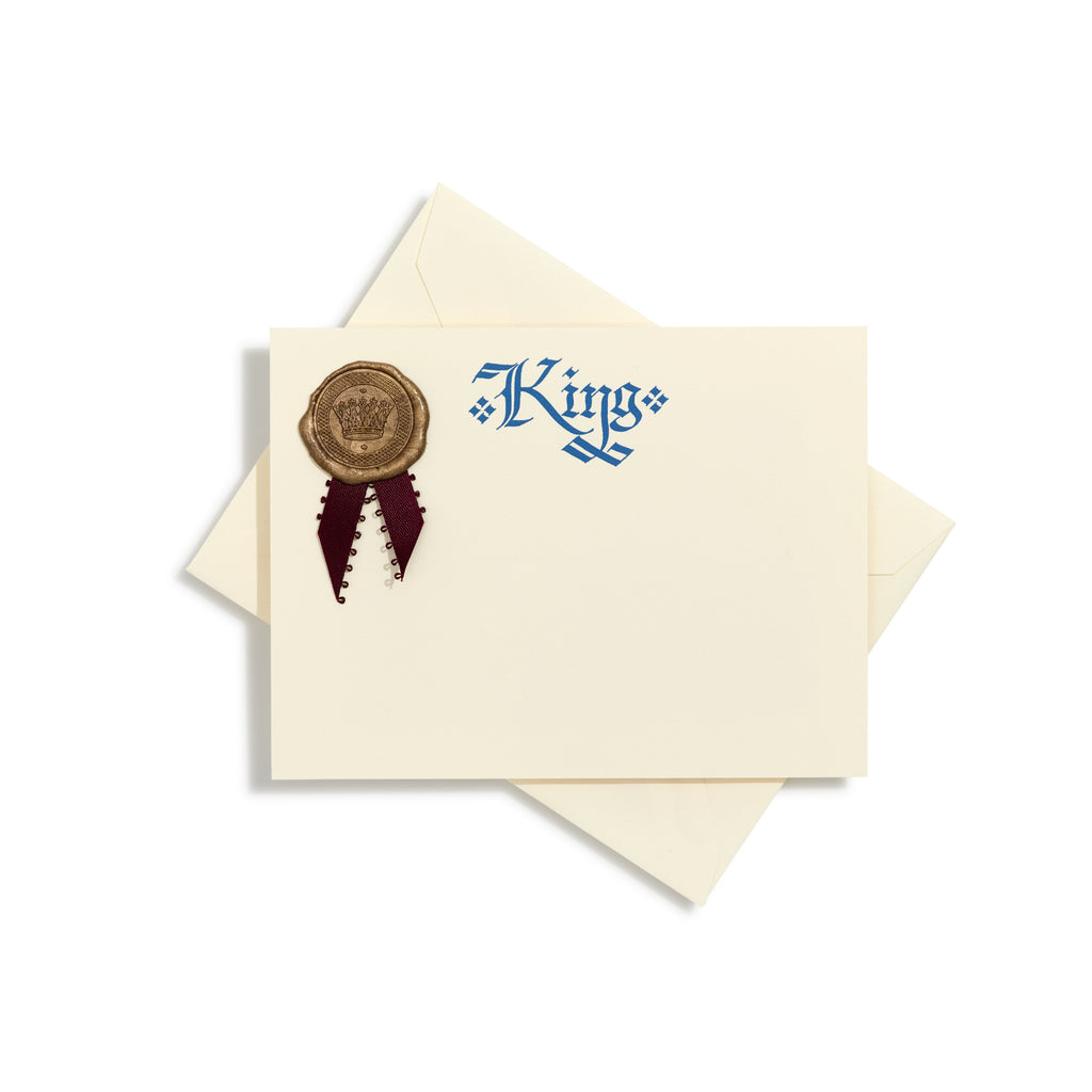 Send a note fit for a king with these regal notecards. Each engraved notecard is individually decorated and stamped with a hot wax seal and satin ribbon. Your recipient is certain to feel like royalty.