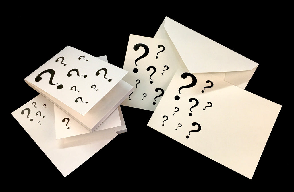 The set for the person who questions everything. Including notecards with envelopes and two notepads. Each card is beautifully engraved in rich black ink, contrasting perfectly on the white cotton stock. The question mark design creates an air of mystery and encourages you to continue questioning and learning. The perfect way to express your personal thoughts or take your notes even if you have no idea what you are about to write. This set is a $135 value.