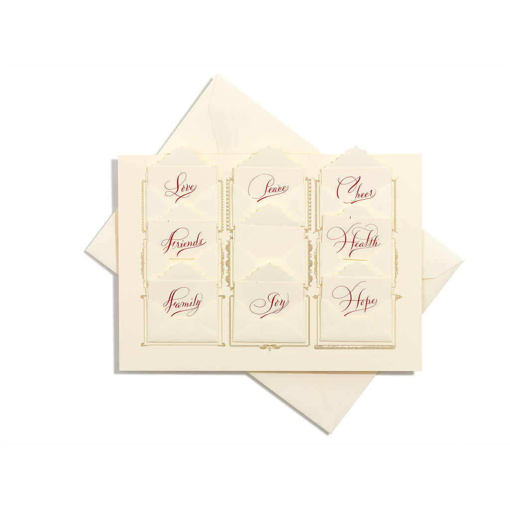 This Grand Statement Secrets Card is the most unique way to capture the festive holiday season. Nine tiny cards, eight featuring beautifully calligraphed words (in red ink) celebrating the season and one card blank card left for your own words, say everything you want to say to the special person in your life. Bernard Maisner's inimitable calligraphy is expertly printed to add flair and beauty. The Bernard Maisner Grand Statement cards are unique in the world of fine stationery requiring multiple press runs and heavy thickness stock.