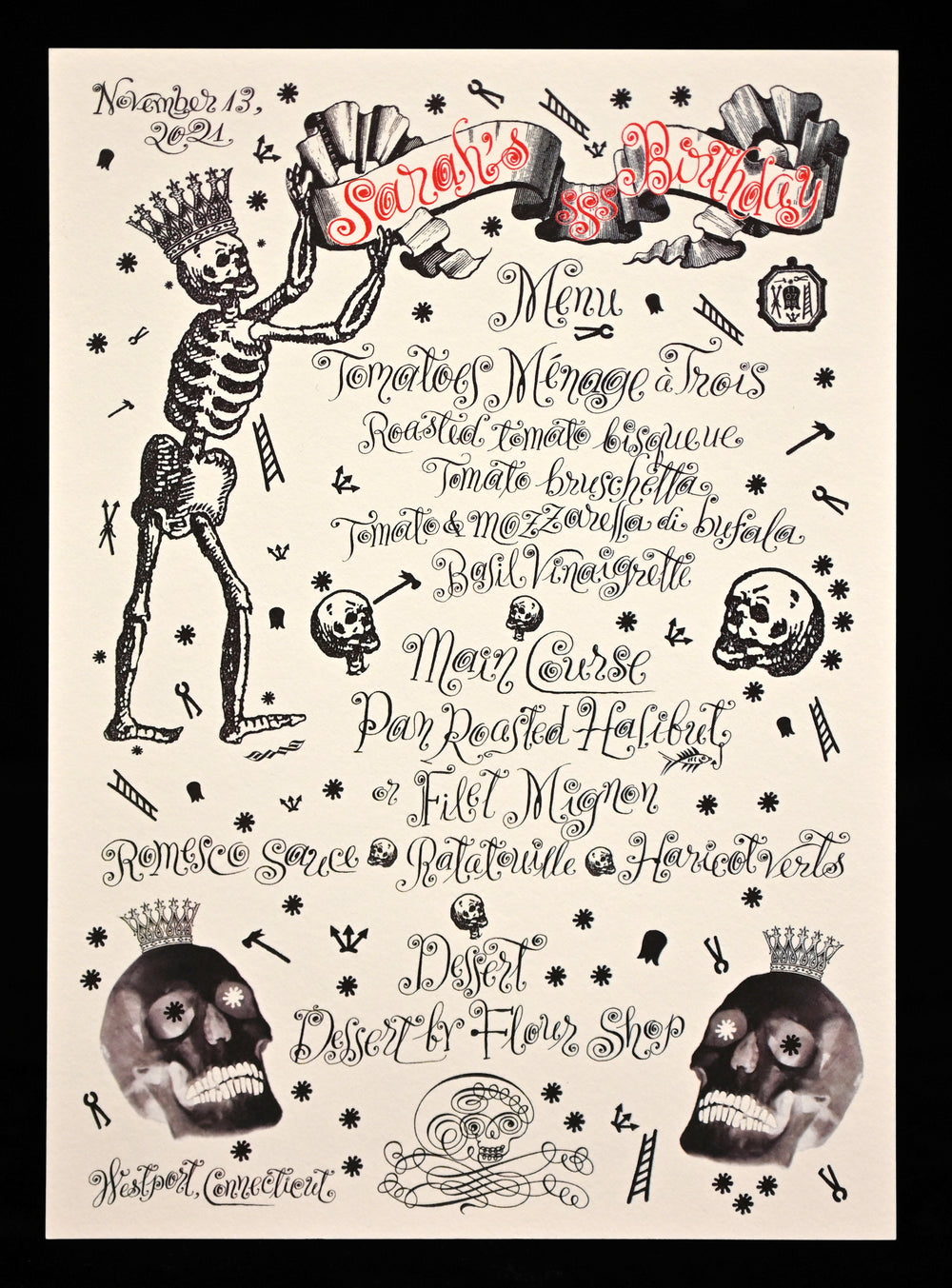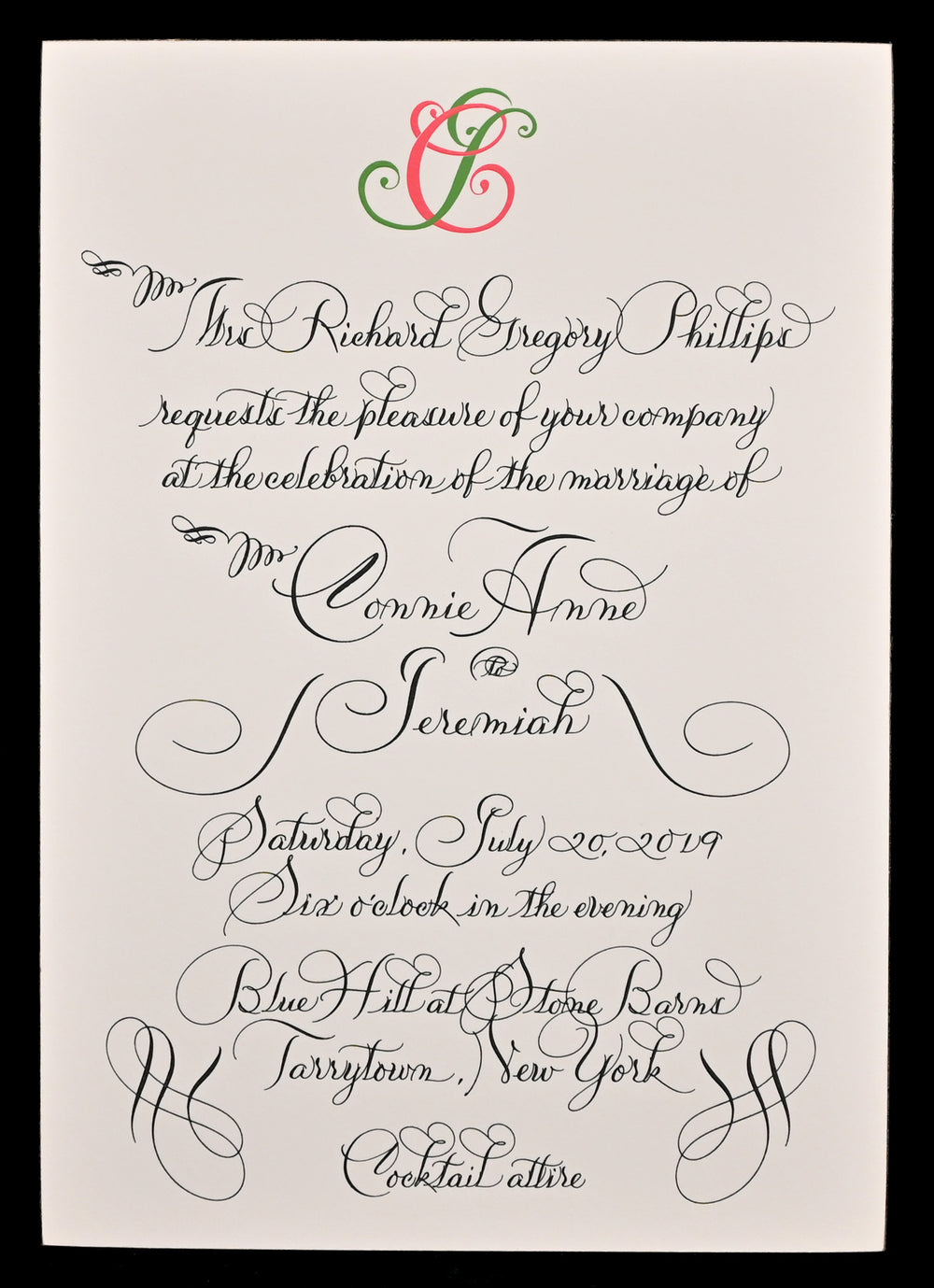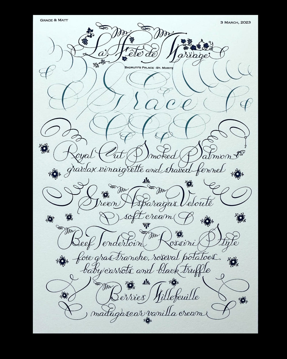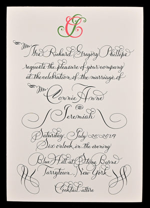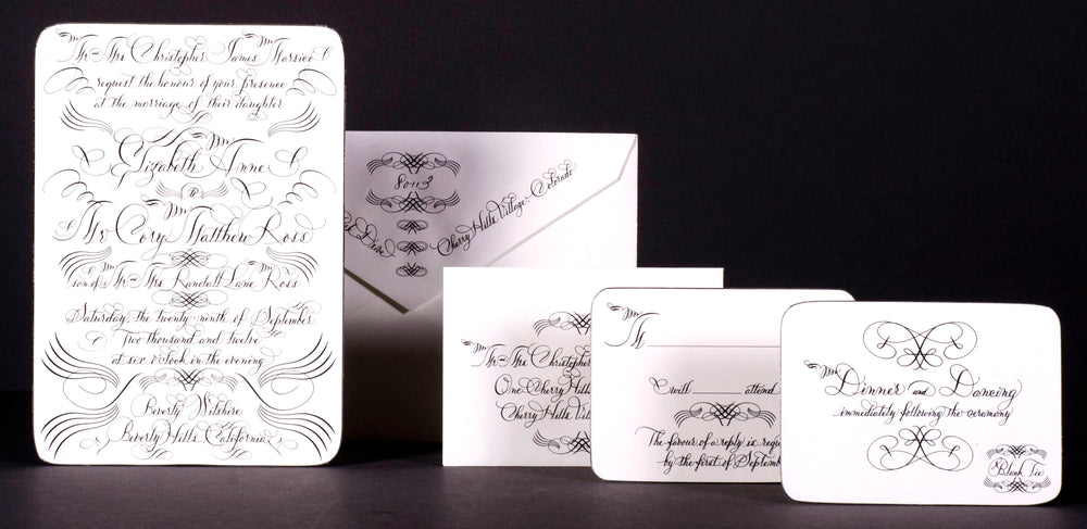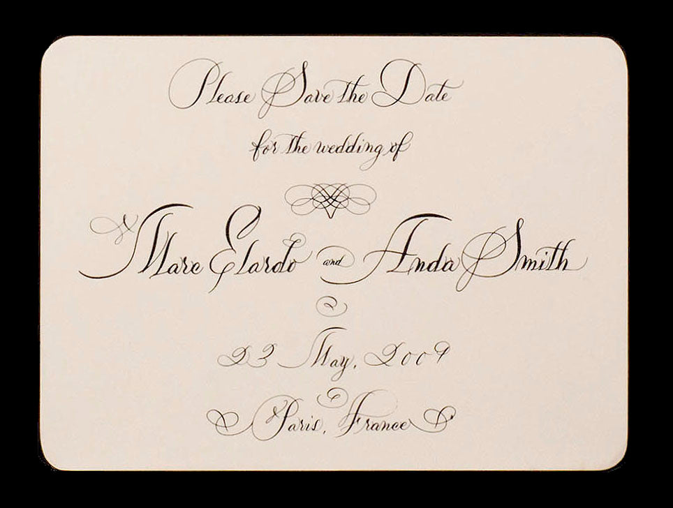 The renowned artist’s distinctive style, which took years to develop, employs intricate flourishing, infused with elements from various calligraphic styles and eras. The signature Maisner calligraphy style—some call it “Maisnerian”—is an adept modernized fusion of the 19th-century American Spencerian and 18th-century European Copperplate styles, updated by Maisner’s modern aesthetics. In addition to his signature script style, Maisner offers his Italian, French and Americana lettering styles.