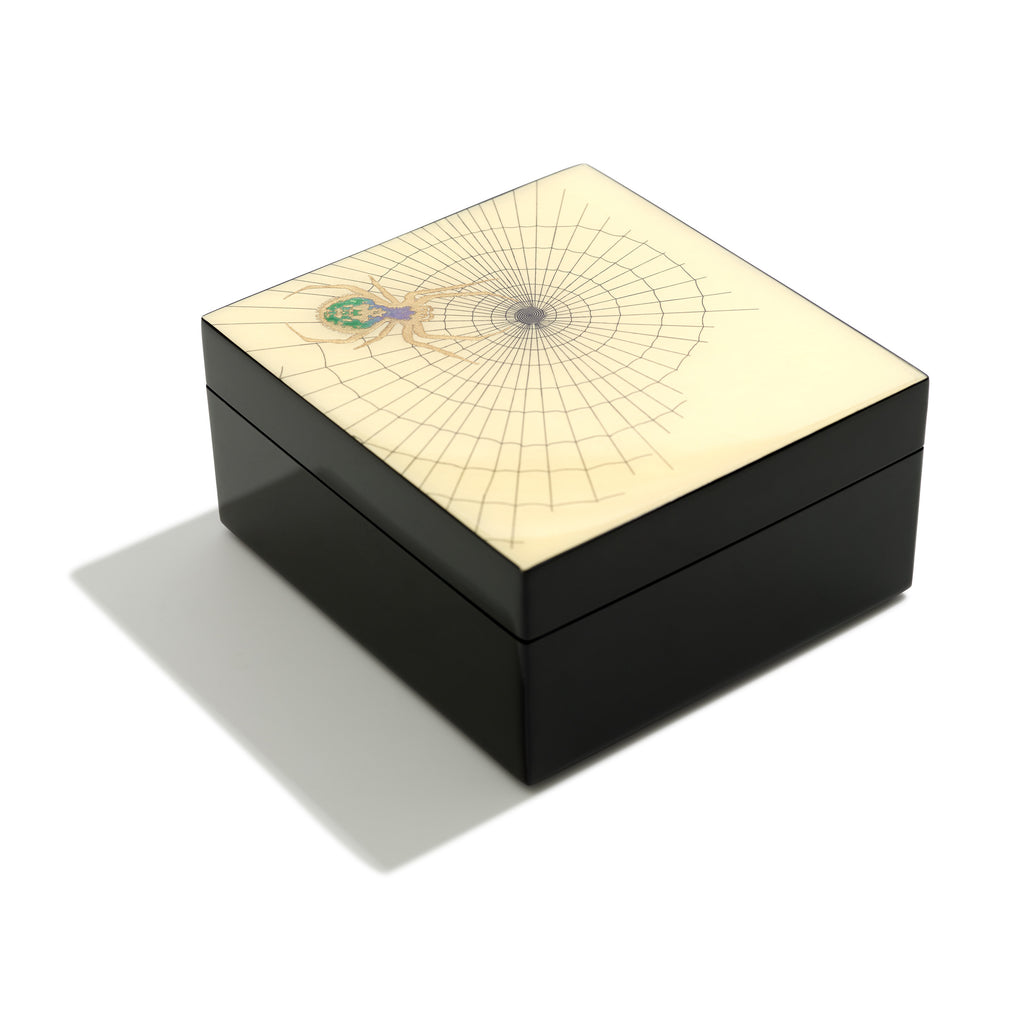 Decor meets function in this uniquely crafted lacquer box. An original engraved and hand painted spider makes each box unique. You can see the depth of the engraved surface under the rich and thick application of the lacquer. The use of color, gold and black create a three-dimensional look in the web of this beautiful spider. The handcrafted wood box is finished using a centuries old method of layering the lacquer finish to accentuate the rich, hand-painted colors and producing a glowing patina. The luxurious felt lining is ideal for storing everything from paperclips on your desk or you most treasured jewelry on your vanity. You could even keep your pet tarantula in it.